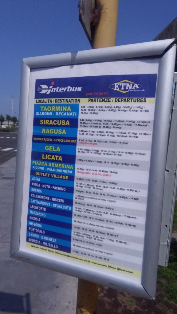 まずはカターニア空港(フォンタナロッサ)に降り立ったら外に出るとバスターミナルになっているのですが、たくさんバス停がありすぎてわかりづらいんですね涙